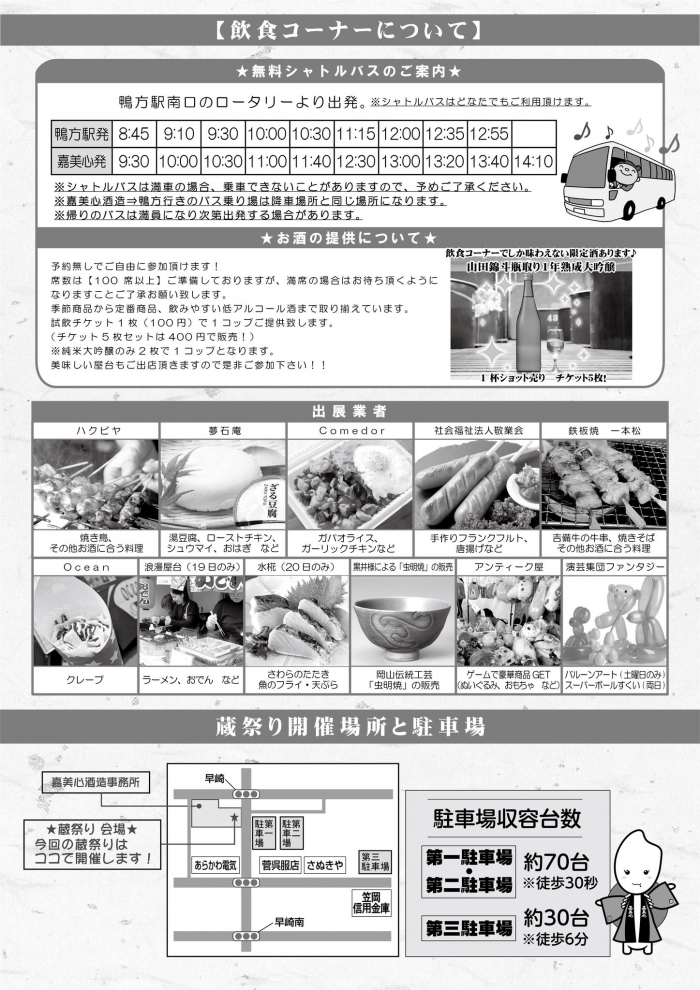 2024.09.25 イベント案内 ☆彡家族で楽しい!秋の蔵祭り☆彡 イベントに出店させていただきます(^^♪↓ ☆彡家族で楽しい!秋の蔵祭り☆彡 ●開催日 2024年10月19日(土)・20日(日) ●開催時間 9:00~14:00 ●開催場所 嘉美心酒造 駐車場 鴨方駅からのシャトルバスも出るので安心してイベントを楽しんでいただけそうですよ! 夢石庵ではいつもながらのお豆腐やお惣菜、お弁当など販売いたします☆彡 冷奴もご用意しております! 飲食コーナーでしか味わえない限定酒もあるそうですよ(';') ぜひお越しくださいませ!(^^)!